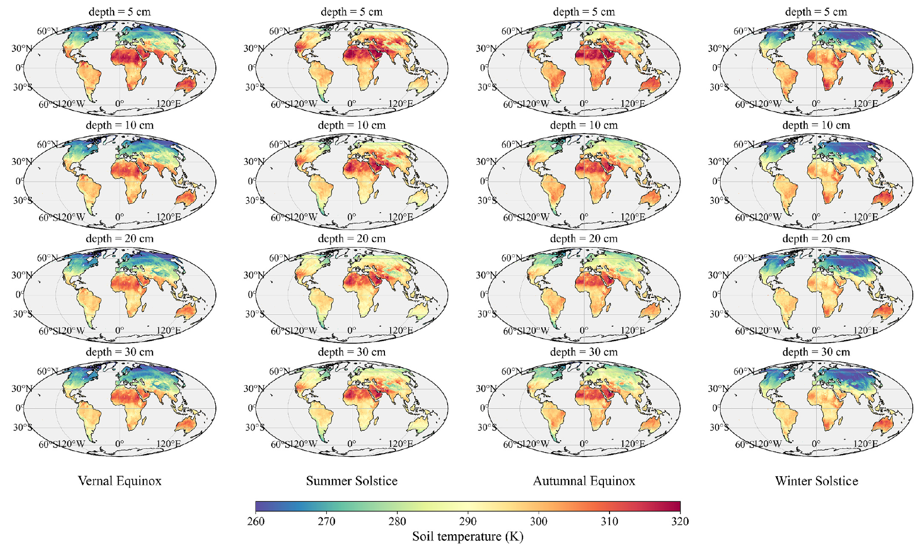 论文针对当前土壤温度遥感仅能获取瞬时地表温度、无法连续刻画深层热力过程的瓶颈问题,提出了基于一维热传导物理机制的土壤温度剖面反演新框架。研究创新性地提出了“日间谐波传播-夜间指数衰减”的组合模型,通过融合中国风云三号气象卫星的多频段微波观测数据与MODIS热红外观测数据(覆盖晨、午、昏等多个地方时),完整捕获了土壤温度的升温、峰值及冷却全过程;同时引入土壤水分、质地等先验信息对热扩散系数和阻尼深度等模型关键参数进行物理约束,首次实现了全球尺度下小时尺度的5/10/20/30cm四层土壤温度的连续反演。经全球450余个站点验证,反演精度显著优于现有再分析产品。该成果突破了卫星遥感仅能感知地表温度的传统局限,为全球分层土壤温度业务化监测体系的构建提供了重要的方法论基础,在农业干旱监测、陆面过程模拟及极端气候事件评估等领域具有广阔应用前景。