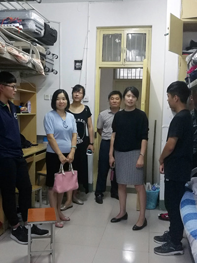 王艳红一行高度重视学生宿舍的安全和新生对大学新环境的适应情况,每到一个宿舍,王艳红都亲切地与同学打招呼,详细询问新生的生源地以及初来大学的感受,了解他们的住宿和生活状况。她叮咛同学们若生活中遇到问题应及时向辅导员反映,同学之间也要相互理解,彼此帮助,尽快融入到大学的新环境中。王艳红语重心长地对新生说:“校园环境是安全的,但不是绝对安全的,尤其开学这段时间,大家要提高防范意识,保证自己的人身安全和财产安全”。许辉在慰问新生时嘱咐同学们,大学和高中不同,要改变以往的思维,提高自己主动学习的能力,并提醒新生关注色情片